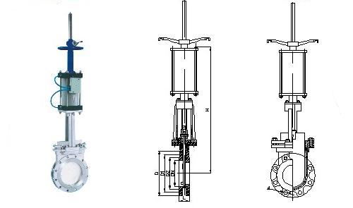 PZ273型氣動刀閘閥,雙驅(qū)動氣動對夾式刀閘閥,PZ273型氣動刀形漿液閥的構(gòu)造圖及主要外形及連接尺寸(mm)