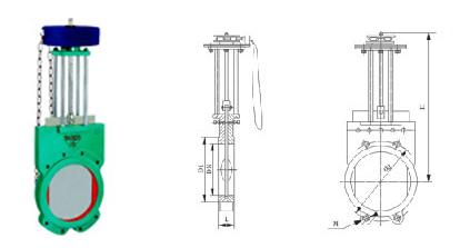 鏈輪刀式漿液閥,鏈輪式鑄鐵漿液閥,鏈輪雙向密封漿液閥,鏈輪式軟密封漿液閥主要外形及連接尺寸