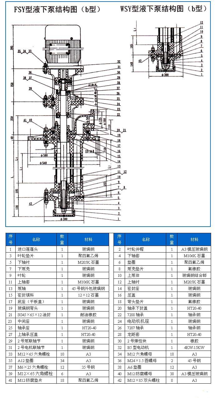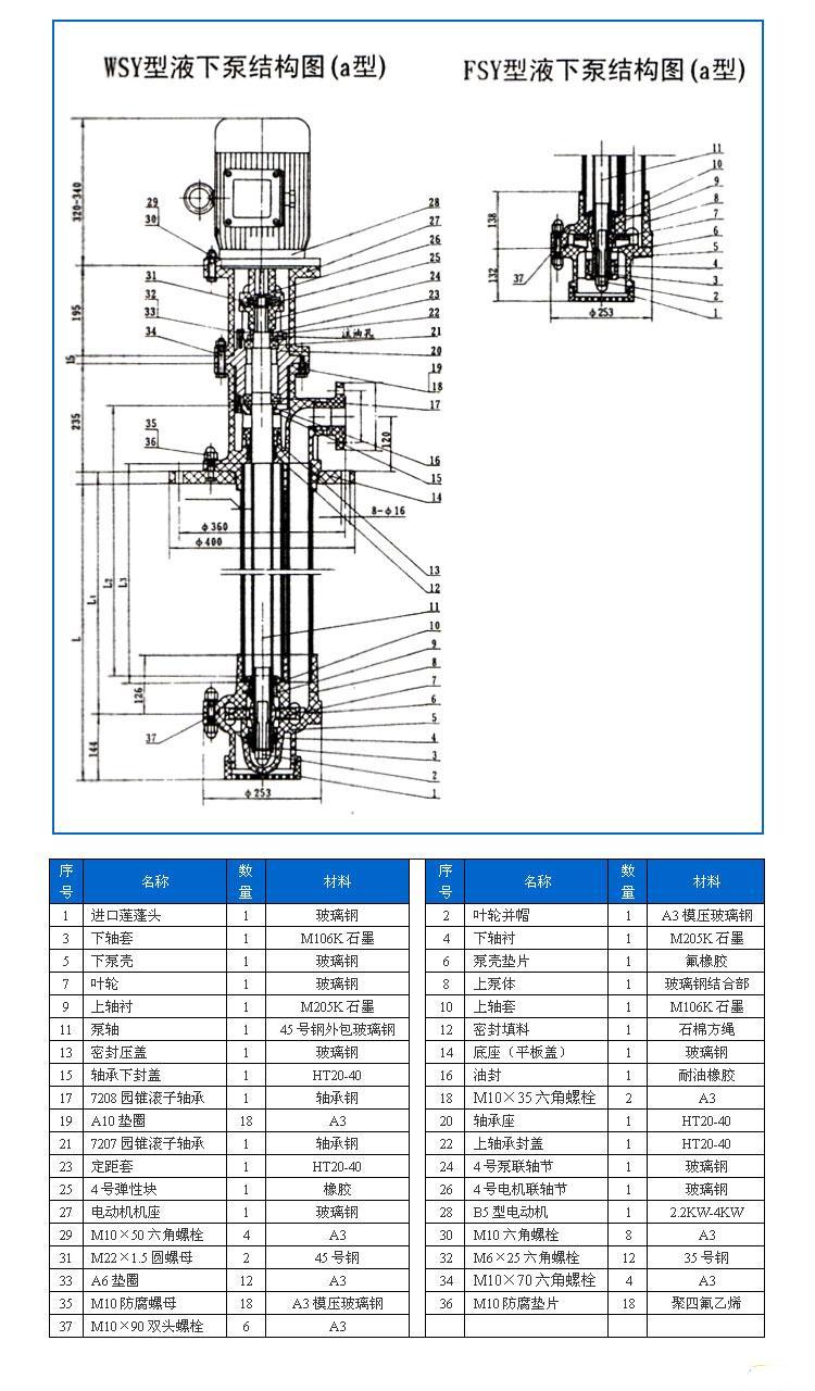 FSY型、WSY型立式玻璃鋼液下泵為本單位生產(chǎn)的WSY型、FSY型兩種型式的泵,1.WSY型立式玻璃鋼液下旋渦泵。2.FSY型立式玻璃鋼液下離心泵,FSY型、WSY型立式玻璃鋼液下泵因伸入貯罐,貯槽的深度長短不同,設(shè)計(jì)液下深度800mm--3000mm之間任意選擇。FSY型、WSY型立式玻璃鋼液下泵只要液體高于泵體,即可不灌液而起動(dòng)送液,平蓋板下設(shè)有泄漏孔,液體不會(huì)向貯罐外泄漏。